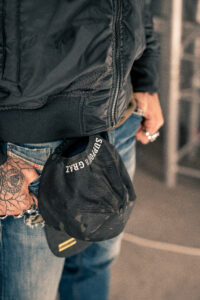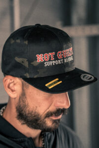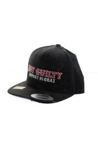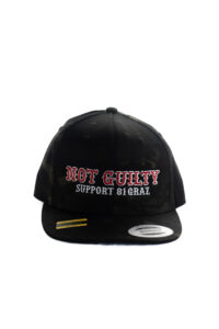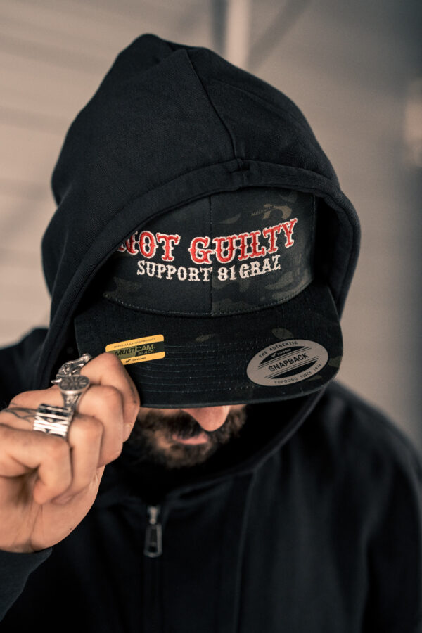 Klassisches SnapBack Baseball Cap camo Style mit coolem Lettering Druck auf der Rückseute und NOT GUILTY Stick auf der Vorderseite